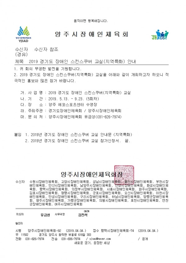 2019 경기도 장애인 스킨스쿠버 교실(지역특화) 안내 관련, 첨부파일을 확인해주시기 바라며