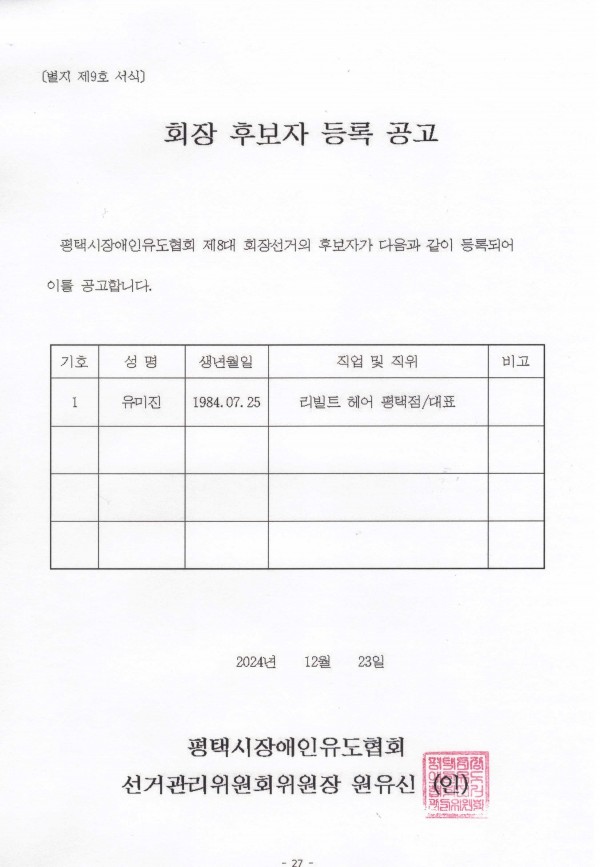 ※2025 평택시장애인유도협회 회장 입후보자 및 선거인명부 공고※
